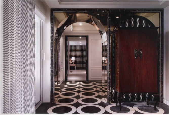 黑底白圈的地坪延伸到起居室。不銹鋼鏡面的傘狀天花,左右對稱的黑金花、金色鍍鈦板拱型穿廊和窗花,使軸線變得方正,也讓玄關形成正式的迎賓空間。