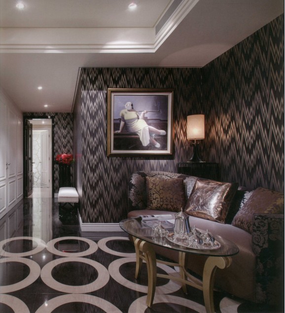 金、銀、白、紫等帶有金屬光澤質(zhì)感的色彩,畫框裱步、編織壁紙、拼花黑檀墻面、銀箔造型電視墻、玻璃馬賽克、貼飾孔雀壁紙……本戶私密空間中,大膽運用多元且綺麗的材質(zhì),堪稱“風華園”中豪門風格的代表作。同時,也將裝飾裝修的藝術美學,發(fā)展得淋漓盡致,令人震撼而驚艷。