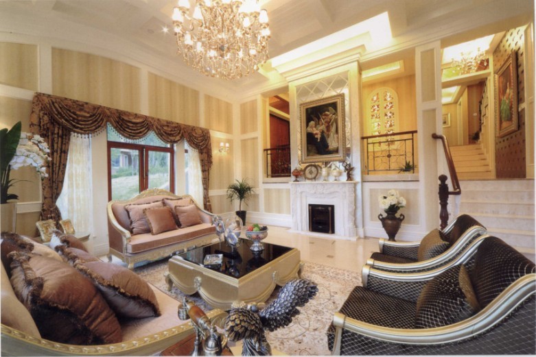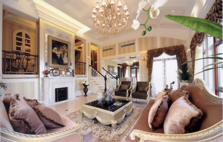 客廳:客廳作為待客區(qū)域,它的裝修較其他空間顯得更為簡(jiǎn)潔明快??蛷d內(nèi)鋪置大面積的地毯,并搭配造型優(yōu)雅而舒適的美式沙發(fā)??蛷d的落地窗簾,盡顯大氣與華貴。頂棚的水晶吊燈絕對(duì)是客廳的一大亮點(diǎn)。