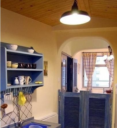 如此美的廚房空間,拱門(mén)上裝飾一扇做舊復(fù)古的藍(lán)色半木門(mén),讓視線眼神出去,空間感變得通透開(kāi)闊。這樣搭配精美的房間對(duì)于生活在鋼筋水泥叢林中的現(xiàn)代人來(lái)說(shuō)絕對(duì)是一種享受。