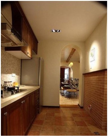 廚房空間很大,整體色調(diào)古樸,仿古磚的鋪貼,墻面磚的裝飾,原木系的整體櫥柜讓室內(nèi)風(fēng)格得以延續(xù)。小而精巧的拱形門(mén)讓廚房空間更添幾分俏皮和浪漫。