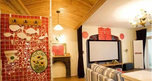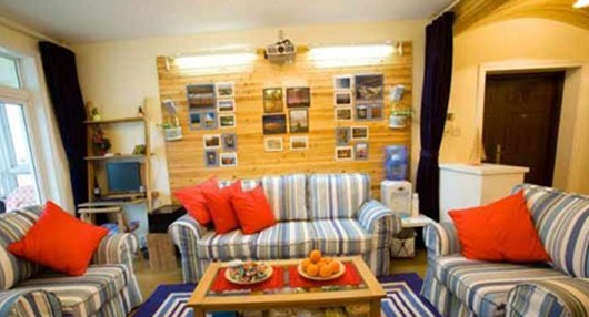 還好,房間還是存在著地中海的氣息的。那也只能從沙發(fā)上體現(xiàn)了。原木的沙發(fā)背景貼上點照片。整個空間出來書是混搭之外,真說不出其他形容詞。