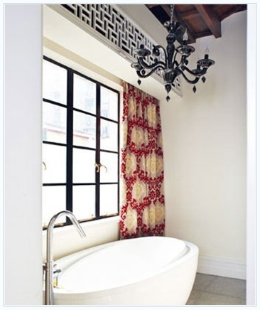 浴室是三樓主人房最有特點(diǎn)的地方,白色的主調(diào)讓空間顯得純潔干凈,厚重的窗簾帶著華麗的花紋為其帶來濃墨重彩的一筆。