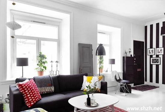 從客廳的側(cè)面放眼望去,客廳的整體空間的主色調(diào)自然是以白色為底,黑色為輔,選用以黑色為主的家具和裝飾品的選擇搭配,再者簡單的紅白搭配的抱枕及地毯也成為客廳的亮色之一,并且活躍了空間的活力氛圍。使得整個(gè)客廳散發(fā)著時(shí)尚氣息,同時(shí),這種混色搭配避免了模式化的冰冷房間,多了一份家的溫馨感。