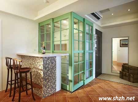 廚房經(jīng)典的美式格子線條,漆上大自然的青草淺綠,前方吧臺不但將電器柜功能融入,馬賽克磁磚讓用餐時充滿趣味,點亮了繽紛的鄉(xiāng)村生活。