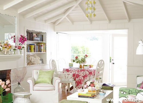 (2)野花是法式田園風(fēng)格最好的配飾,因?yàn)樗钪苯觽鬟_(dá)了一種自然氣息,有一種直接觸摸大地的感覺??蛷d垂落在窗臺(tái)上的優(yōu)雅的花布窗簾,粉綠色的墻面,以及臥室淡紫色的墻面,相同色系的小碎花家紡和窗簾等都讓我們的心情豐盈而快樂。