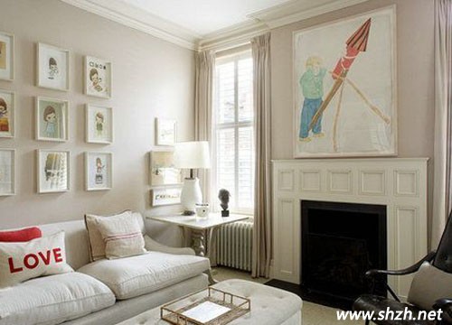 代替一整幅的壁畫(huà),用多個(gè)小相架裝飾單調(diào)的墻壁,還能展示新婚夫婦的結(jié)婚照,讓客廳縈繞著甜蜜。紅白搭配的抱枕起到隔開(kāi)大片白**塊的作用,讓房子達(dá)到冷暖平衡。