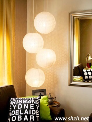 圓形的頂燈線條分明,且結(jié)構(gòu)簡單。用棉布纏繞后這個球狀造型,高低不同而錯落有致的懸掛在沙發(fā)區(qū)頂部,搭配上客廳里同樣以棉質(zhì)為主的布藝靠包,將樸實無華的自然主義情節(jié)展露無遺。