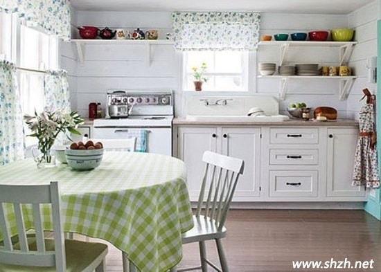 廚房也要有春天,看這桌上淡綠色條文桌布,清新自然,大自然的景象很快就呈現(xiàn)在我們面前。除了桌布,還有美麗的窗簾,白色的廚房配上藍(lán)色碎花薄布窗簾,更顯清新可愛。暖暖的陽光照進(jìn)廚房,讓人感覺很溫馨舒適。
