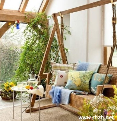 用木板搭制而成的架子,可以懸掛著搖椅,休閑之余還能品品茶,看看各類書刊雜志,再欣賞春天的美景,一切都是多么的愜意。綠油油的樹藤一個勁的沿著木桿往上爬,春天活躍動感的氣氛立即呈現(xiàn)在我們面前。地上在擺放些鮮花綠草,整個春的氣息撲面而來,使整個家居更生動活潑。