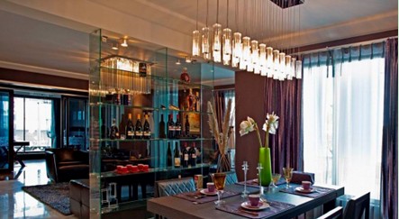 設(shè)計師試圖營造一種低調(diào)奢華的現(xiàn)代簡約氛圍,一種既厚重華麗又具時尚特色的視覺效果。整個空間用硬朗的金屬和玻璃與柔性的墻紙搭配,及黑白兩色的大理石地面相互映襯,再加上家具和軟飾的和諧統(tǒng)一,使的整個空間時尚簡約但又不失奢華。本案中,設(shè)計師十分注重細(xì)部的處理及創(chuàng)新設(shè)計;