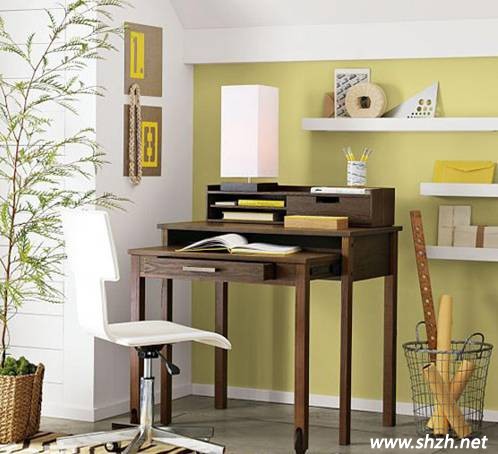 選擇一角放置幾塊簡單實用的隔板,再選擇一款有木質紋路的小書桌,用草綠色的墻紙,將這個角落改造成一個清新的小空間。我們所選的書桌雖然小小的,但它的神奇之處在于它可以伸縮自如,對于小戶型的空間來說真是一件寶貝;帶抽屜的小書桌閑暇之余還能存放手機、MP3等等日常的用品。另外這款書桌還可以搭配擴容架,讓功能更強大。