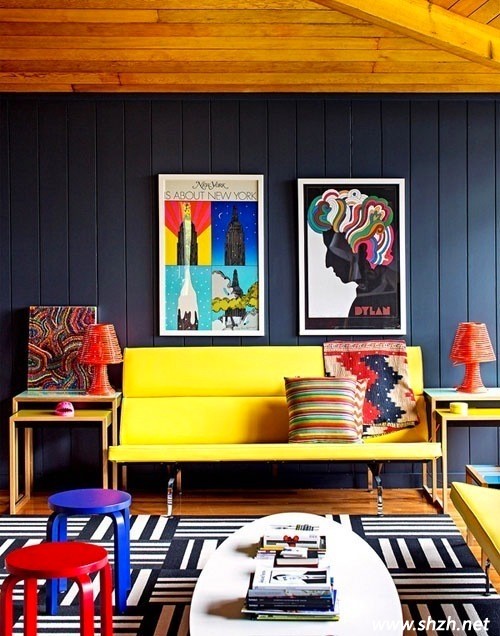 四、組合式:這是一種組合式的裝飾方法,由一組畫構成裝飾效果,裝飾中心是一幅主畫,這樣能起到突出中心、主次分明 的視覺效果。兩邊圍繞著裝點,物品可以多種多樣。這一組設計兩邊掛著中國瓷器,且全是青花裝飾,這樣比掛置五彩盆子更顯示了優(yōu)雅。下面是現(xiàn)代圖案,這些圖 案沒有取工整的人物畫或山水畫,這是對的,否則與青花圖案的工整對沖,組合上就不嚴密。這一組裝飾融合了西方與中國傳統(tǒng)的風格。顯示了主人中西兼容的開放 式心態(tài)。同時也顯示主人的不俗,既沒有完全媚外,也沒有一味地厚古。