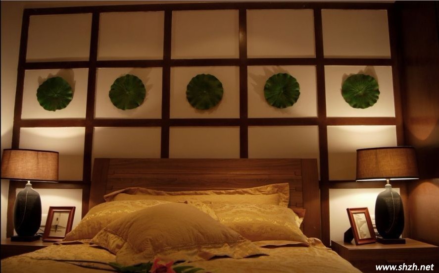 以五片荷葉為背景的背景墻嵌入周圍的實木格,再搭配床頭柜和臺燈,別有一番韻味。邊桌、臺燈,壁掛,都有著傳統(tǒng)的亞洲風格特色。南亞風情標志性