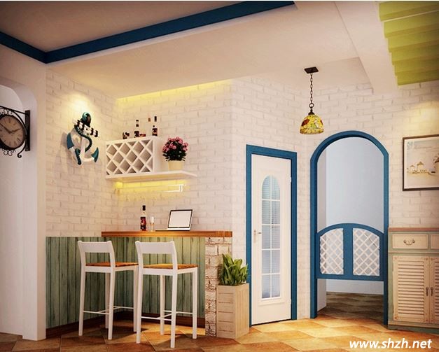 二:貼墻式吧臺。上海裝潢網(wǎng)小編認為,如果你家是小戶型的房屋,除了餐桌式的多功能吧臺,這種貼墻式的吧臺也是不錯的選擇。設(shè)計要點:把你喜歡的吧臺就緊貼著一段較小的墻面擺放,非常節(jié)省空間的設(shè)計,另外要是想追求一下藝術(shù)效果的話,那么你可以在吧臺的上面就是頂棚嵌入漂亮的筒燈,不同顏色的光束打在你家精致的酒具上,整個效果會非常的時尚。