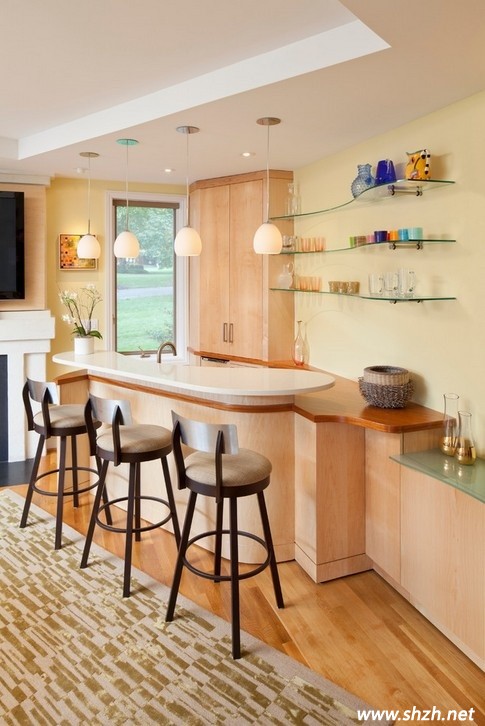四:轉(zhuǎn)角式吧臺。設(shè)計要點:苦于沒有多余的地方來安放吧臺的話,你家的房間轉(zhuǎn)角部位也是個不錯的選擇,只要你安排的合理,不僅可以讓你的居室看起來整齊緊湊,而且有客人來訪的時候圍著吧臺而坐,非常方便。