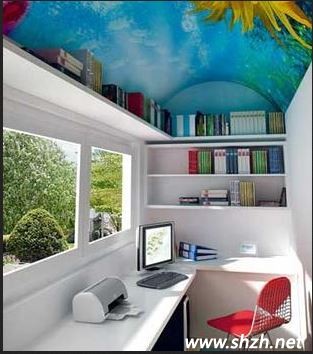 陽(yáng)臺(tái)變書(shū)房:如果你家也是不足70平的一居室小戶型,那么肯定不會(huì)有多余的空間來(lái)設(shè)計(jì)出一個(gè)書(shū)房來(lái)享受靜靜閱讀的樂(lè)趣,這樣是不是就意味著你必須要放棄書(shū)房呢,那可不一定,因?yàn)槟阃耆梢院煤美闷鹉慵业年?yáng)臺(tái),只要改造的好一個(gè)小巧但是創(chuàng)意十足的書(shū)房便可輕松享有了。圖一中地中海風(fēng)格的小書(shū)房面積雖然很小,但是在功能上比起大書(shū)房毫不遜色,天藍(lán)色的吊頂與純白墻面、書(shū)架、書(shū)桌交相呼應(yīng),紅色的座椅成了這個(gè)小書(shū)房中的亮點(diǎn),也是主人的別有用心。
