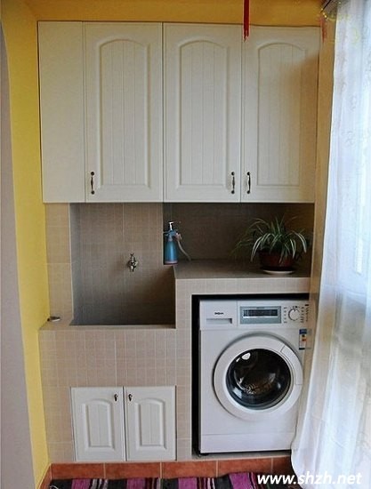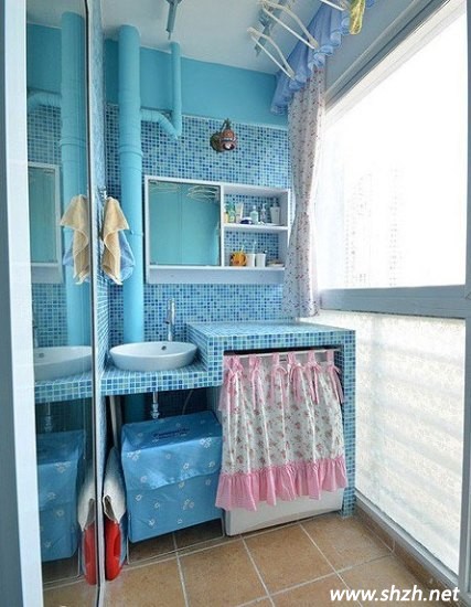 陽(yáng)臺(tái)變洗衣房:陽(yáng)臺(tái)的改造當(dāng)然遠(yuǎn)遠(yuǎn)不止改成書(shū)房,如果你家衛(wèi)生間的空間不大,或許只有一個(gè)馬桶與淋雨的地方,那么洗衣機(jī)放在那里比較好呢?小編給你建議:不要浪漫你家的陽(yáng)臺(tái),將陽(yáng)臺(tái)改裝成洗衣房在現(xiàn)在小戶型裝修中很流行,而且把洗衣機(jī)放在陽(yáng)臺(tái)中也非常的方便,衣服洗好了之后直接就可以晾曬了,看圖二中的小細(xì)節(jié),設(shè)計(jì)師連洗漱去也巧妙的安置在陽(yáng)臺(tái)這個(gè)小空間里了。整體陽(yáng)臺(tái)的改造都采用藍(lán)色的馬賽克,濃濃的地中海風(fēng)情撲面而來(lái),非常清新的感覺(jué)。洗漱區(qū)要是不喜歡的話你也可以將這些地方改放成用來(lái)收納衣物或者是雜物的柜子,也是非常實(shí)用的設(shè)計(jì),例圖三。