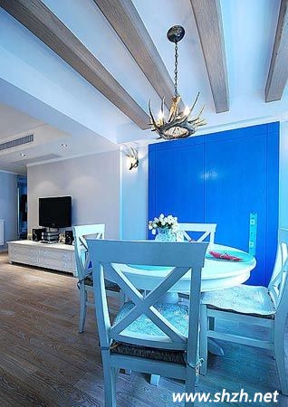 地面:地面和沙發(fā)都選用白色的,很好的緩沖了藍色所帶來的大面積的沖突感,整個空間看起來更加的協(xié)調(diào)。