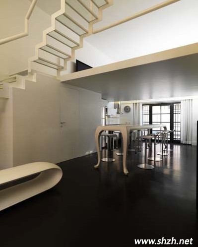 上海裝潢網(wǎng):圖一中的三幅是這個(gè)LOFT的第一樓,南北通透的房型最好布局了,設(shè)計(jì)師把廚房安放在進(jìn)門處,讓每一位來者第一時(shí)間感受到家的溫馨,轉(zhuǎn)身即到的餐廳中,餐桌采用吧臺(tái)的造型,時(shí)尚美觀,另外大家看見餐桌后的白色櫥柜了嗎?即使有很大的空間,設(shè)計(jì)師仍然沒有浪費(fèi)樓梯下的大好空間,在此打造了一個(gè)容量巨大的收納室。最后順著餐廳走過,一樓的另一端墻壁也完全打開,門外的陽(yáng)臺(tái)也是一道風(fēng)景線。