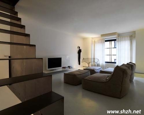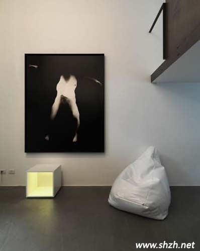 順著一樓的白色樓梯,簡(jiǎn)短的上行后,我們來帶了這個(gè)LOFT的二樓。二樓因?yàn)橐尦鰞蓚€(gè)樓梯的空間,所以剩下的空間被隔成一個(gè)“L”型,第一個(gè)樓梯的盡頭處就是這個(gè)小客廳了,沒有繁雜的裝修,簡(jiǎn)單的沙發(fā)、電視與榻榻米飄窗構(gòu)成了一個(gè)時(shí)尚個(gè)性的會(huì)客空間。走過客廳,轉(zhuǎn)身來到一個(gè)簡(jiǎn)易的工作區(qū)域,為了與一樓呼應(yīng),設(shè)計(jì)師干脆把工作臺(tái)也設(shè)計(jì)成吧臺(tái)的造型,讓你隨時(shí)享受吧臺(tái)樂趣。銜接客廳與工作區(qū)的過道處,一幅抽象畫點(diǎn)亮了單調(diào)的白色墻壁。