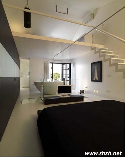 三樓臥室圓床邊的樓梯通向四樓,圖四中的第一幅圖可以看見四樓的全景,左側(cè)是一個(gè)巨大的浴缸,讓你享受沐浴的快樂,右側(cè)也是一個(gè)臥室的設(shè)計(jì),整棟LOFT的風(fēng)格都是極致簡(jiǎn)約。四樓中還有一個(gè)樓梯,小編這里就不為大家展現(xiàn)五樓的風(fēng)景了,由大家去想象吧!