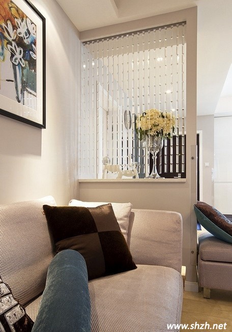 鏤空隔斷的設(shè)計(jì)出了上面的兩個(gè)創(chuàng)意,水晶幕簾也謂是一道搶眼的風(fēng)景線,透明的水晶簾與白色墻壁給人一種夢(mèng)幻的感覺(jué),加上玄關(guān)鞋柜上放置的透明玻璃花瓶與亮黃色的鮮花,室內(nèi)的一切都蒙上了童話般的色彩。