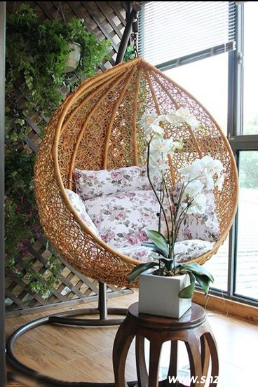中式風(fēng)格的圓形鏤空坐凳,配上現(xiàn)代時(shí)尚的圓形吊椅,趣味十足。而后面的竹子編織而成的鏤空隔斷,古色古香的感覺,很有中式的風(fēng)味,整個(gè)區(qū)域搭配得十分協(xié)調(diào)。