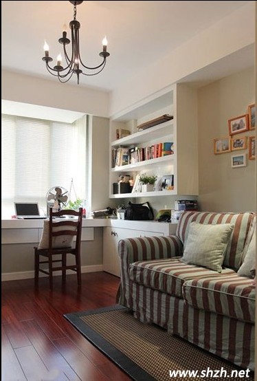 客廳的設(shè)計(jì)主要以時(shí)尚潮流的美式風(fēng)為主,清爽的白色布藝沙發(fā),精致奢華的抱枕,處處散發(fā)著美式風(fēng)的魅力,連一角的綠植都那么的清新自然。沙發(fā)背景墻上的掛畫,花朵圖案的相框正式中式風(fēng)格的魅力所在。而茶幾上的青花瓷,則是中國(guó)最具民族特色的瓷器裝飾,如今被廣泛運(yùn)用到各類型風(fēng)格的家裝中,也帶來(lái)了不一樣的裝飾風(fēng)采。大大落地窗戶上,圓形里的“福”字,更是將中式風(fēng)格進(jìn)行到底,凸顯著中國(guó)傳統(tǒng)的文化,將中式風(fēng)描繪得淋漓盡致。這兩種相異的風(fēng)格起到了相互凸顯和補(bǔ)充的效果,產(chǎn)生出奇制勝的功效。