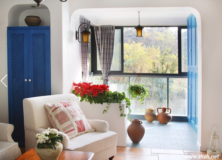 角落里的風(fēng)采。嵌入式的深藍(lán)色柜子,帶著濃濃的海洋風(fēng)味,而地面上的各種藝術(shù)裝飾瓶,個(gè)性張揚(yáng)可愛,各種鮮花綠植,更是增添了幾分自然清新的氣息。白色的單人沙發(fā),清新雅致。藍(lán)色調(diào)的柜門,更是唯美浪漫。藍(lán)白色調(diào)的完美結(jié)合,造就了浪漫的地中海風(fēng)范。