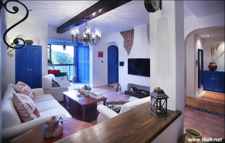 原來,從客廳走向餐廳的走道旁邊,還設(shè)計(jì)兩個(gè)拱形的門,這是地中海風(fēng)格典型的建筑設(shè)計(jì)。拱形門下的藍(lán)色格子地磚,將不同功能的區(qū)域嚴(yán)格的分開來,非常的惟妙惟肖。白色的墻壁,非常寬敞舒適,純潔美麗,也給我們帶來無(wú)限的遐想空間。而房間的門,以藍(lán)色打造,藍(lán)白色調(diào)的空間,總是那么的浪漫和溫馨。