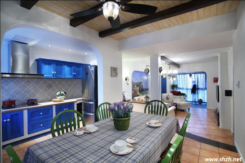 當(dāng)真正的進(jìn)入餐廳,真是讓我眼前一亮。透過拱形門就是廚房的區(qū)域了,藍(lán)色調(diào)的櫥柜門是那樣的夢(mèng)幻。而餐桌上的紫色薰衣草,當(dāng)法式風(fēng)味飄進(jìn)地中海居室內(nèi),是不是更加的浪漫唯美呢?