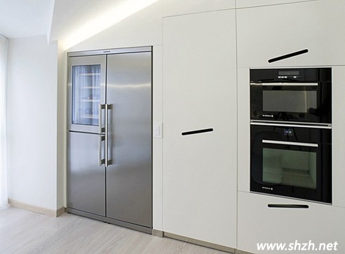 廚房的設計也不能落后,各種獨特的設計讓人驚嘆。白色的廚房空間,盡顯寬敞和明亮,而碗柜上的門把手,摒棄了傳統(tǒng)的模式,并不是整齊的排列,而是歪歪扭扭的設置在廚門之上,變得趣味十足,也讓人感覺到它的活潑與調(diào)皮。