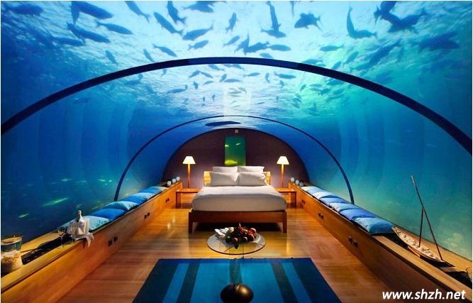 現(xiàn)代有些地區(qū)的游樂(lè)場(chǎng)都會(huì)有海底世界,很多人會(huì)去那里體驗(yàn)海底的生活,看著各種各樣的魚(yú)在水里盡情的游蕩,三五成群的非常可愛(ài)。也許,你也會(huì)想擁有這樣的一個(gè)臥室設(shè)計(jì),這樣可以盡情的觀賞海洋的生物,夢(mèng)幻般的生活非常美妙。而今天,這樣的夢(mèng)想終于可以實(shí)現(xiàn)??催@款全玻璃裝飾的海底臥室,設(shè)計(jì)師巧妙的設(shè)計(jì)不得不讓人驚嘆,充分利用了自然環(huán)境的優(yōu)勢(shì),把自然景觀融入到臥室的設(shè)計(jì)中,仿佛徜徉在海底世界一樣,很奇妙吧!