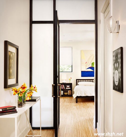 臥室可是最隱私的區(qū)域,當(dāng)然不希望暴露在視線內(nèi)。這款玄關(guān)區(qū)域,正對的是十分少見的臥室空間,因此,臥室區(qū)域自然要有東西進(jìn)行隔斷保護(hù),而帶有門的毛玻璃隔斷,有效的將2個(gè)區(qū)域分開,同時(shí)也起到了雙層防護(hù)的作用,是不是很有創(chuàng)意呢?