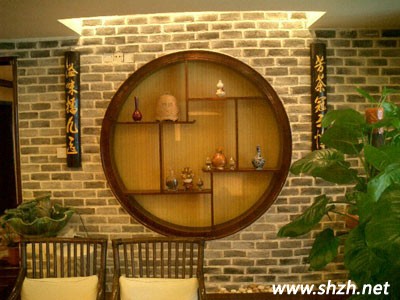 這款就是純中式的玄關(guān)設(shè)計(jì)了,圓形的博古架,擺放著各種很有質(zhì)感且很有價(jià)值的裝飾品,更體現(xiàn)出了中式傳統(tǒng)的感覺,而兩邊的對聯(lián),則是中國最傳統(tǒng)的文化,整個(gè)區(qū)域空間盡顯傳統(tǒng)風(fēng)味。