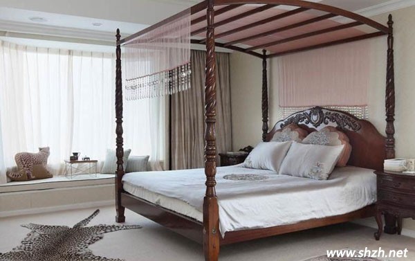 主人的臥室也設(shè)計(jì)的十分高貴,法式四柱大床,古典而雅致,不過(guò),最大的亮點(diǎn)莫過(guò)于地上的豹皮地毯了,這是一種非洲的裝飾,遠(yuǎn)處的飄窗再一次成為家人的私享茶座。