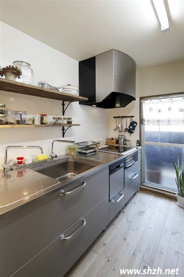 不銹鋼的整體櫥柜簡潔明亮,而且大的抽屜櫥柜擁有強大的收納功能,而上面用木板搭制成收納區(qū)域,可以放各種調(diào)味品、餐具和廚具,非常方便拿取,有利于廚房區(qū)域的保潔。