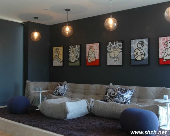 方案二:復(fù)古風(fēng)是現(xiàn)在的當(dāng)紅明星,無論是潮流的80、90后,還是保守的70、60后,復(fù)古風(fēng)都能一起特有的風(fēng)采俘獲他們的心!DIY又是復(fù)古中最愛,看這間客廳中的沙發(fā)與吊燈,都選用了上世紀(jì)的款式,與現(xiàn)代感強(qiáng)烈的照片墻無意間形成對(duì)立面,這樣的對(duì)立卻意外的和諧,我想這大概是深藍(lán)色墻壁與褐色毛絨地毯的功勞。