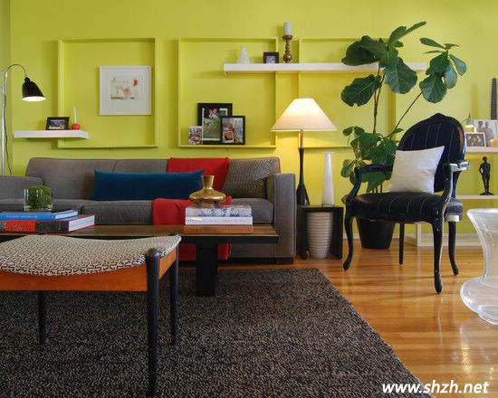 方案四:活潑的翠綠色墻壁,沉穩(wěn)的咖色沙發(fā)與低碳,典雅的歐式公主椅,每一件事物間好像都獨(dú)立的存在,卻又和諧的融在一起。沙發(fā)背景墻的設(shè)計(jì)非常有個(gè)性,鏡中鏡、框中畫,這是設(shè)計(jì)師的獨(dú)具匠心。畫框造型的硬裝為其中的照片提供了擺放地,這一切都是相輔相成的存在。
