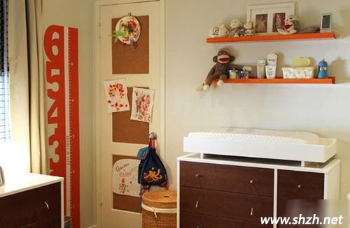 孩子的空間收納性也是很有講究的,不僅要找個(gè)空間將孩子的物品裝在里面,同時(shí)也要將一部分小物品擺放在外面,增添整體的可愛氣息,這時(shí)候木板就起到了很大的作用,下圖中,橘紅色的兩塊木板上,分層釘在墻壁上,可以分層擺放山高一些小的卡通物品,實(shí)用物品,活潑可愛的同時(shí),也增加了收納性,一舉兩得,墻上的身高測(cè)量尺讓孩子自己也能隨時(shí)為自己測(cè)量,讓孩子的成長(zhǎng)增添了無(wú)限的樂(lè)趣。