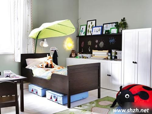 一片大樹葉支在床的上面讓孩子仿佛置身在森林中,清新自然。若要將房間營(yíng)造出童話般的氣息,就要多用卡通玩具等裝飾品,這樣才能給孩子充分發(fā)揮想象的空間,藝術(shù)的空間同樣也給寶貝藝術(shù)的靈感,讓孩子從小就擁有自己的設(shè)計(jì)夢(mèng)想。