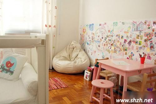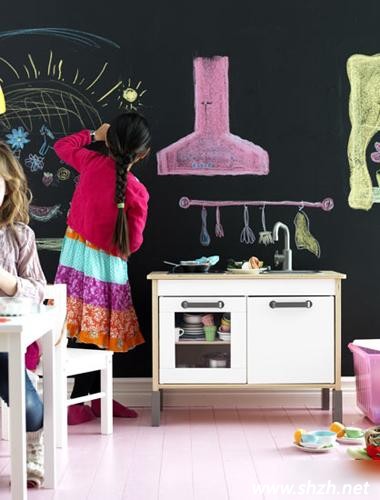 是否為孩子喜歡在墻壁上畫畫而煩惱呢?是否擔(dān)心寶貝將剛剛弄好的潔白的墻壁弄臟呢?那就專門騰出一面墻壁,作為寶貝的畫板吧。這面墻壁上,我們可以將孩子平時(shí)畫的作品隨意貼在上面,不僅起到了裝飾作用,而且還能將這些看似無(wú)用的東西利用起來(lái)。同時(shí),也可以將家中的一面墻作為一塊黑板,可以讓孩子隨意在墻壁上涂鴉,用彩色粉筆,描繪美好的生活,孩子在學(xué)習(xí)中遇到的一些問(wèn)題也可以在黑板上教會(huì)他們。
