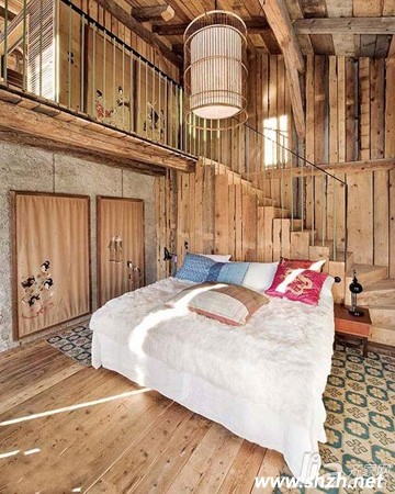 臥室被別出心裁的安排在了樓梯旁邊。白色毛絨絨的床上用品讓人一看就有躺上去的沖動。大大的吊燈溫暖著整個空間。