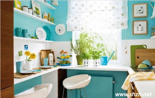 這款設(shè)計,首先色彩就給我們非常舒適的感覺。藍色的墻壁裝扮,顯得清新而自然,或許,這樣的設(shè)計更適合夏天,絲絲涼意入人心。墻壁上隔板的設(shè)計,使得空間的收納變得靈活而個性,廚房盡顯美觀與整潔。
