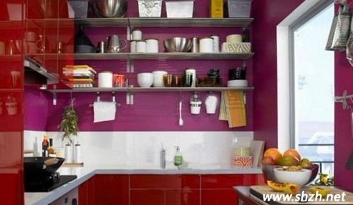 這是色塊大量運用的空間,紫色與紅色的完美搭配,整個空間變得更加嫵媚動人。墻壁上隔板打造,擺放各種廚房用具,也是空間的一大亮麗風景。使得整個空間就像一個展覽區(qū)一樣,各種產(chǎn)品任意挑選,盡情享受進餐的樂趣。