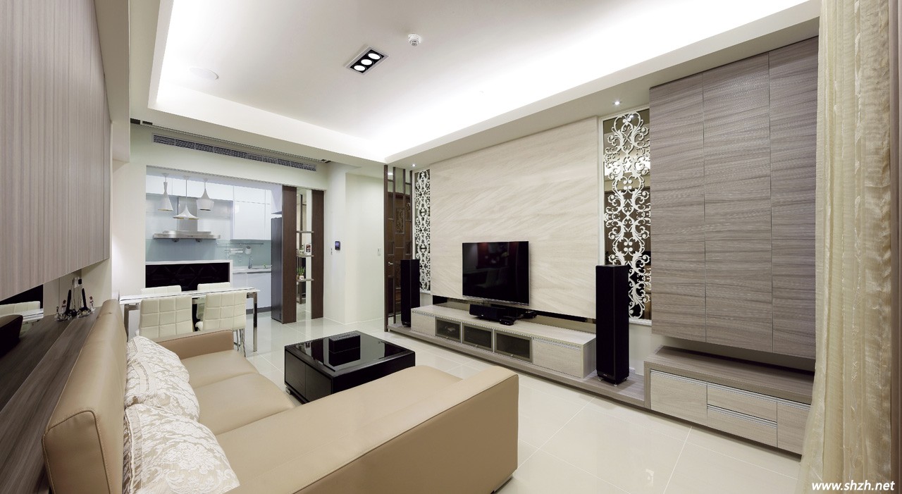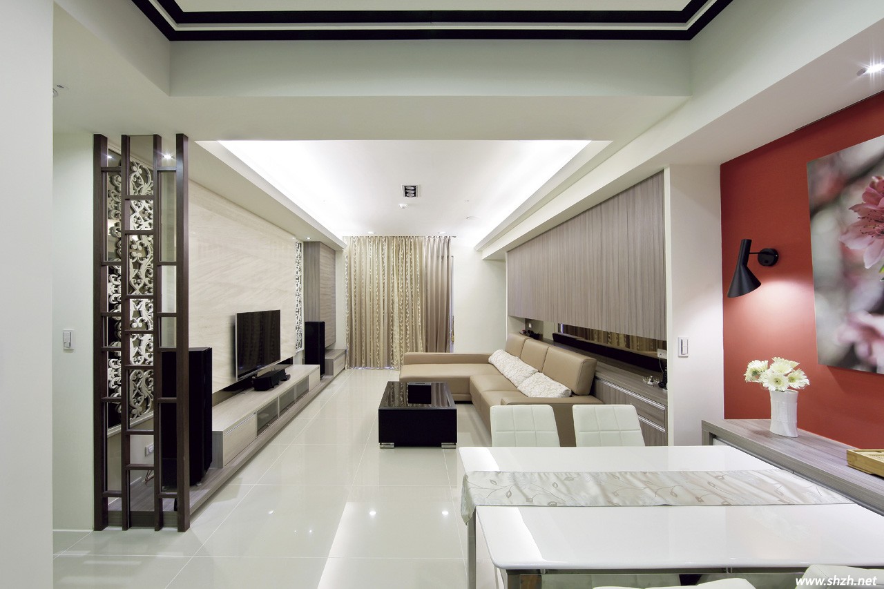 在客廳的設(shè)計(jì)中,考慮電視主墻跟玄關(guān)有銜接關(guān)系,于是設(shè)計(jì)師藉由大地色柜體與主墻大理石作色彩呼應(yīng),但以質(zhì)地界定出主配角地位。接著在兩側(cè)茶鏡前襯上白色雷射雕刻的窗花來增加造型,如此一來,柔和的色系帶來舒適感受,空間也因方整的柜體確保了簡潔實(shí)用的底蘊(yùn),而曲線柔美的裝飾則回應(yīng)了女主人保留浪漫的心愿。此外,設(shè)計(jì)師還利用沙發(fā)上的大梁作墻面統(tǒng)籌,先以中央斷開的上下排系統(tǒng)柜呼應(yīng)電視主墻幅寬,并透過茶鏡反射強(qiáng)化明亮與景深。