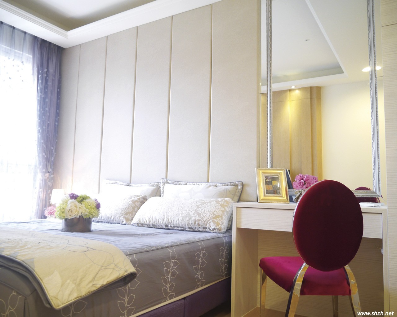 來到臥室中,主臥床頭的淺褐色皮革響應(yīng)公共空間色調(diào),直條的繃板縫隙不僅降低了平面的呆板,瘦長的分割比例也具有拉高墻面的視覺效果。床鋪側(cè)對(duì)著更衣室,為使空間有所區(qū)隔,設(shè)計(jì)師利用灰玻璃與鏤空的白色窗花結(jié)合,如此一來,臥房的柔軟感倍增,色調(diào)上也與鏡面鑲了銀框的梳妝臺(tái)更為融洽。梳妝臺(tái)旁利用短墻深度作一個(gè)直達(dá)天頂?shù)母吖瘢吖裆隙艘蚤T片遮掩,底部3/4則規(guī)劃成側(cè)拉形式,讓女主人能輕松取用和收納保養(yǎng)品。