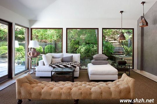 室內(nèi)的兩邊墻壁完全鑿開全部用作飄窗,簡單的木質(zhì)鑲邊,沒有華麗窗簾的遮遮隱隱,將外面明媚陽光,山水美色盡覽眼中,身處室內(nèi)如同置身大自然。室內(nèi)家具的裝修都是現(xiàn)代簡約風(fēng)格渲染外面的自然美景,兩個(gè)古銅色的吊燈又給別墅增加了一絲復(fù)古韻味。