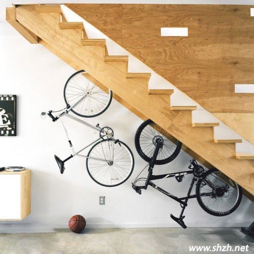 開放式的樓梯不僅方便用作書架,用來掛放自行車也非常不錯。愛好自行車運動的人,家里難免有幾輛自己喜歡的自行車,放在家里占用太多空間,那學小編把它掛起來吧。是的家里既美觀了,又節(jié)省了空間。